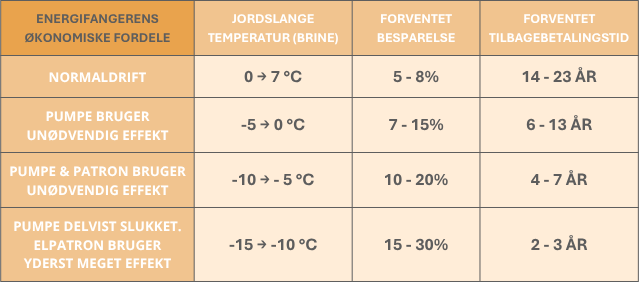 - Varmere væske i jordslanger – varmepumpen er mindre belastet